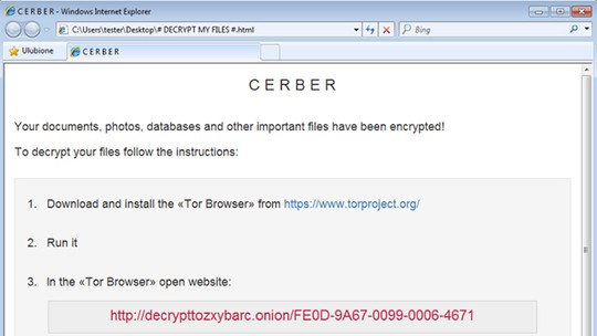 Mensagem de resgate do vírus de resgate Cerber. (Foto: Reprodução - Malwarebytes)